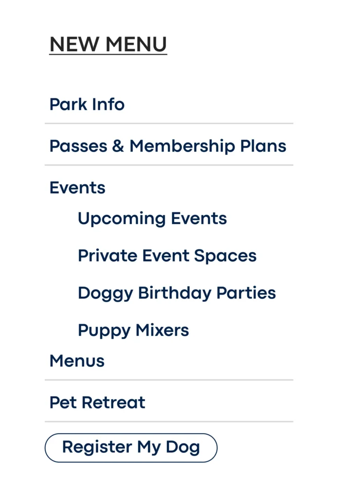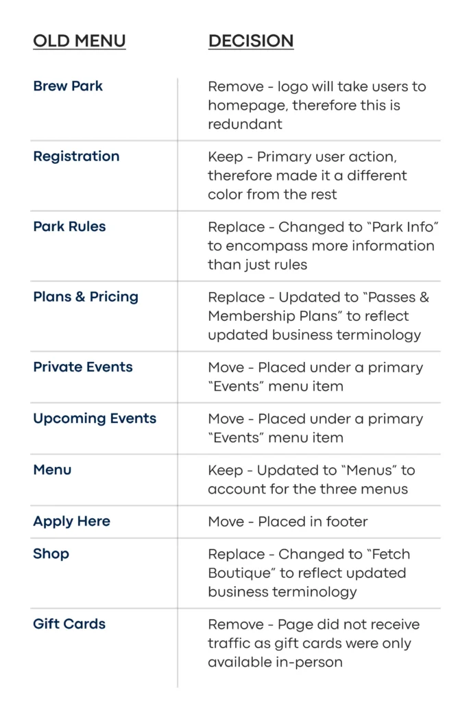 One of the first steps toward redesigning the site was to restructure the site navigation. Data from Google Analytics and conversations with employees & customers led to the new navigation. Data highlighted pages with the most and least traffic as well as corresponding exit rates. For instance, a page like “Gift Cards” had the lowest traffic of any page, an above average exit rate, and next to no conversions, therefore, we decided to cut it from the navigation.